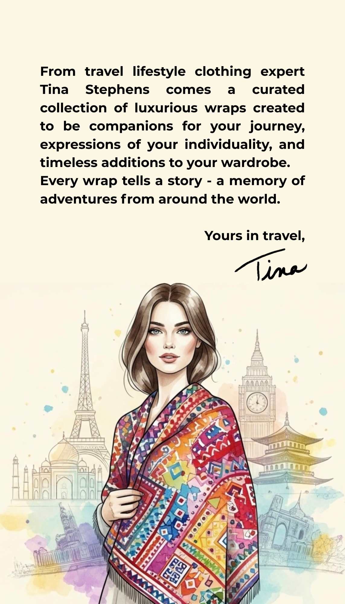 At Wraps by Tina, we believe that luxury should be lived in. Our wraps are more than garments—they’re companions for your journey, expressions of your individuality, and timeless additions to your wardrobe.