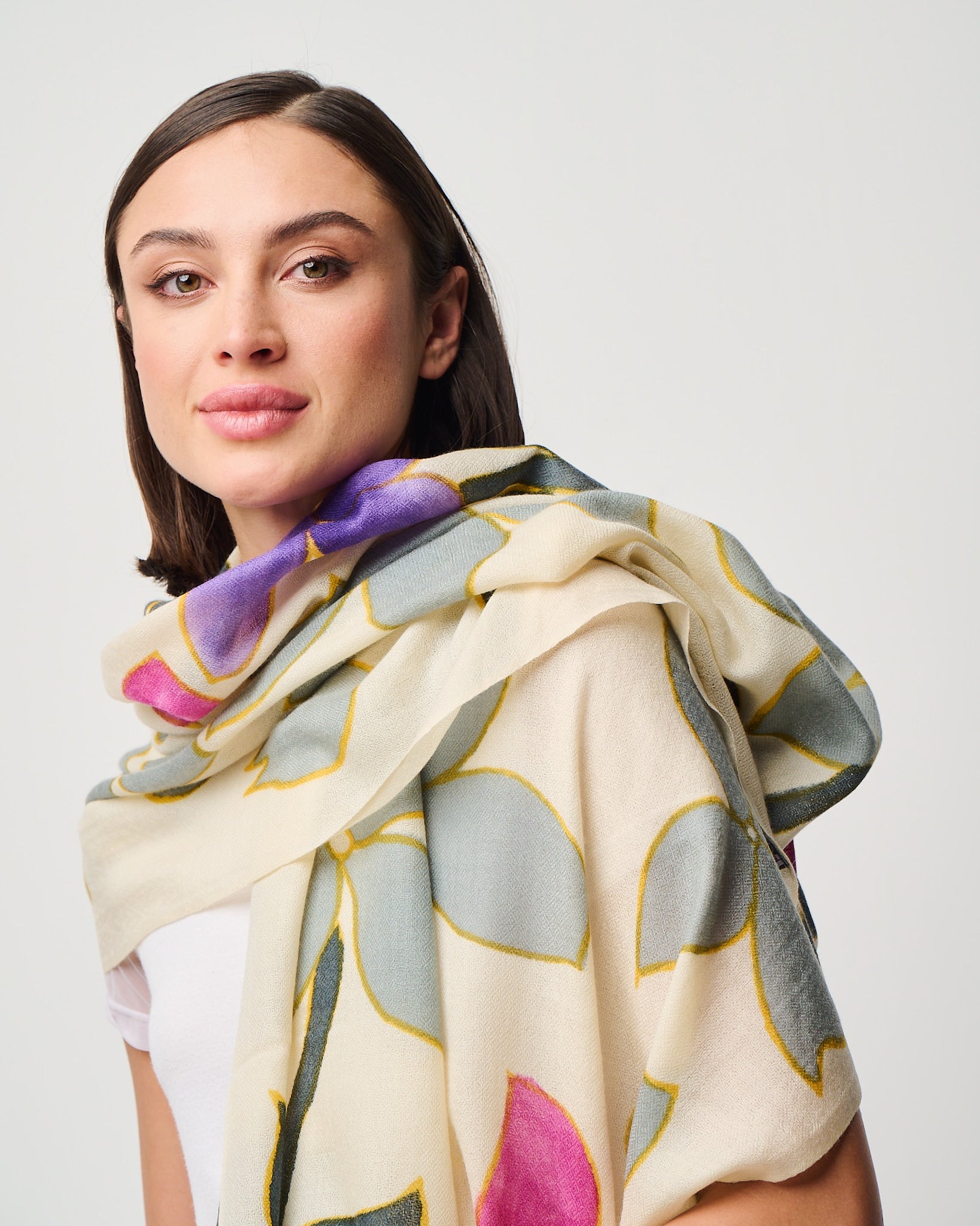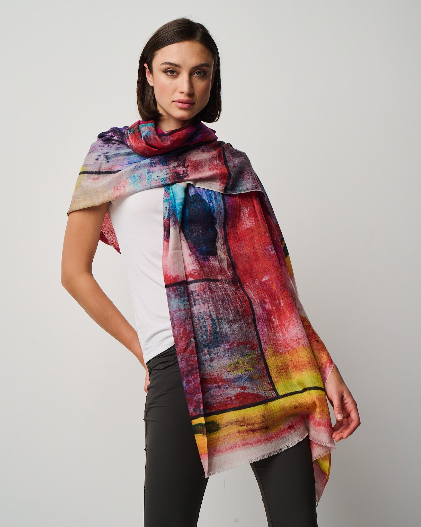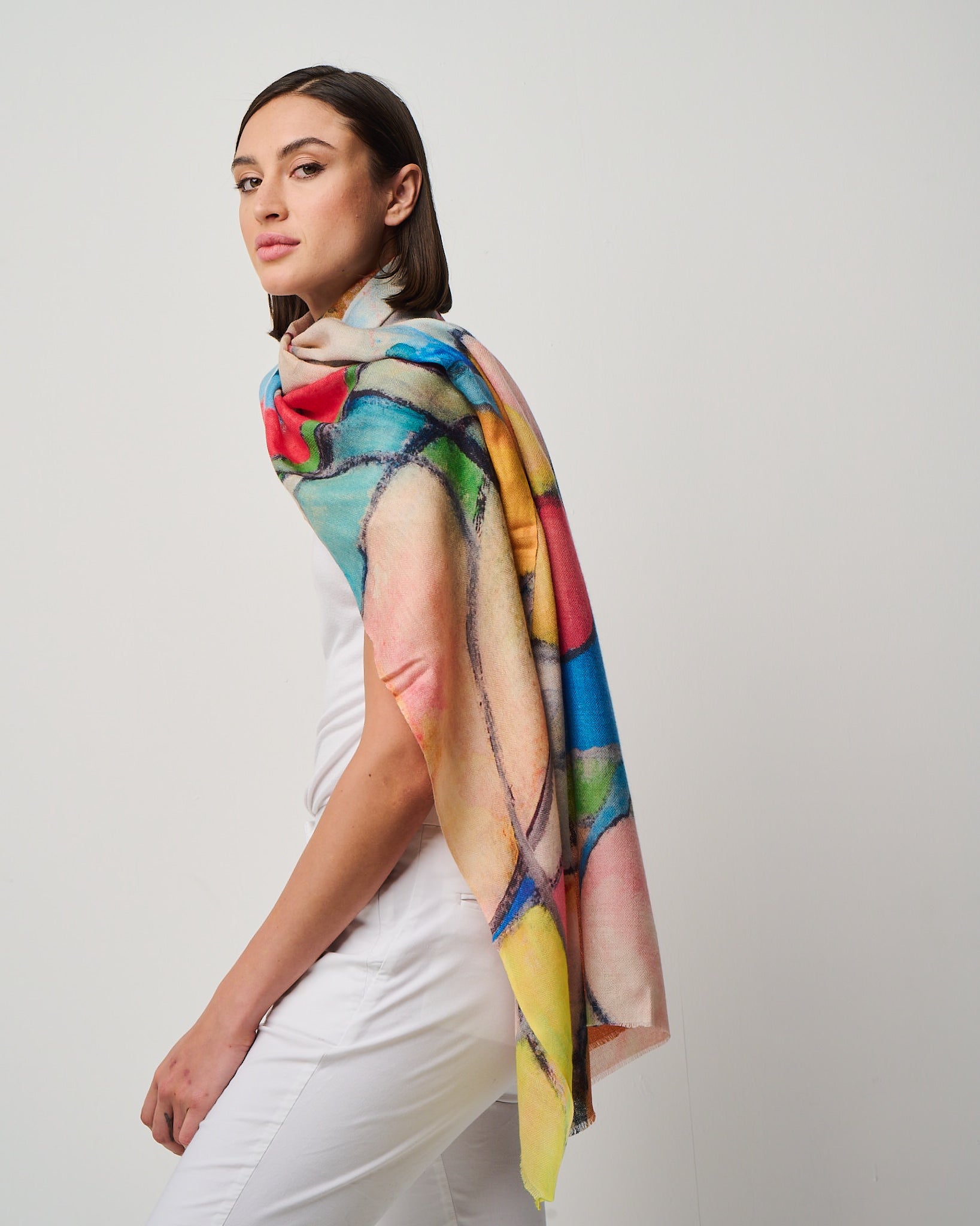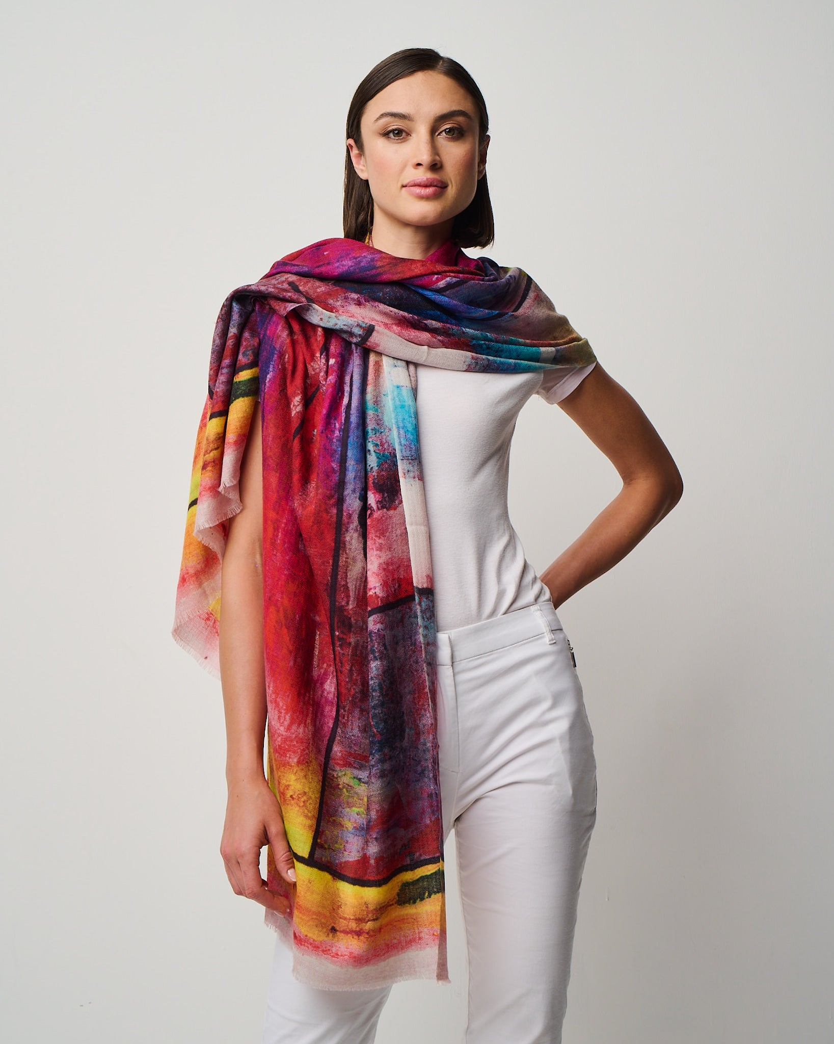 Crafted from the exquisite cashmere fibers of the Kashmir region, this INDIVIDUALLY hand-painted wrap is a walking piece of art.