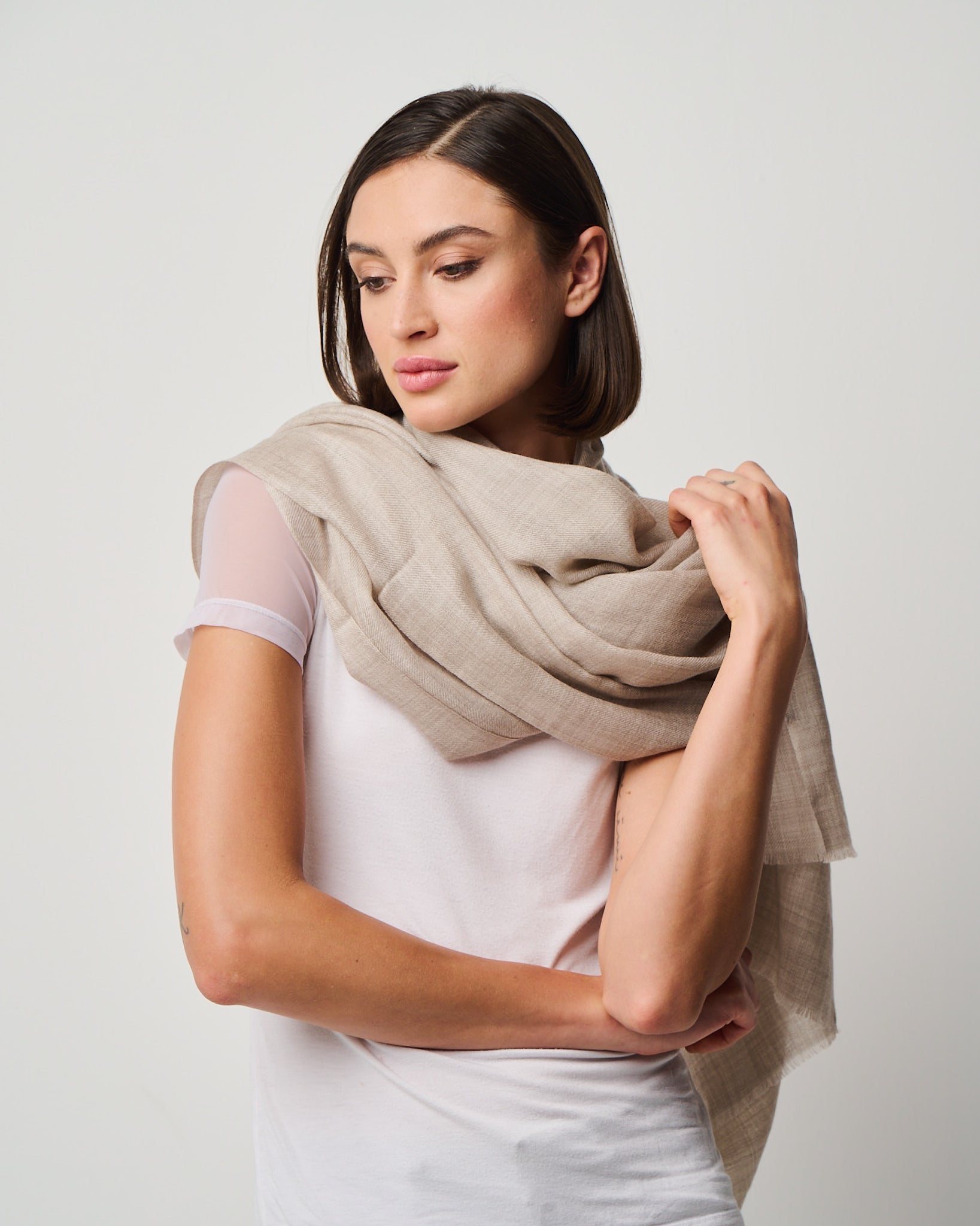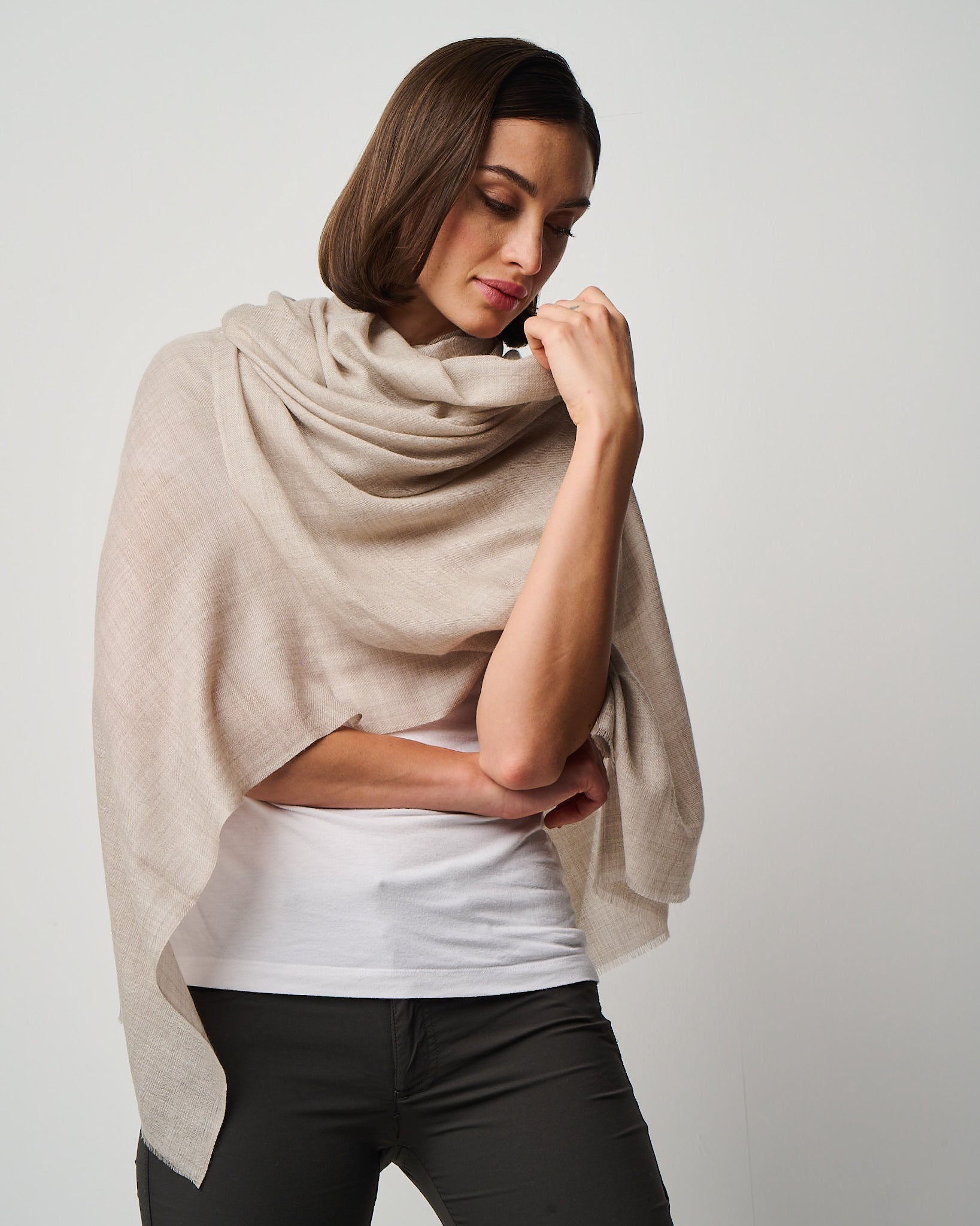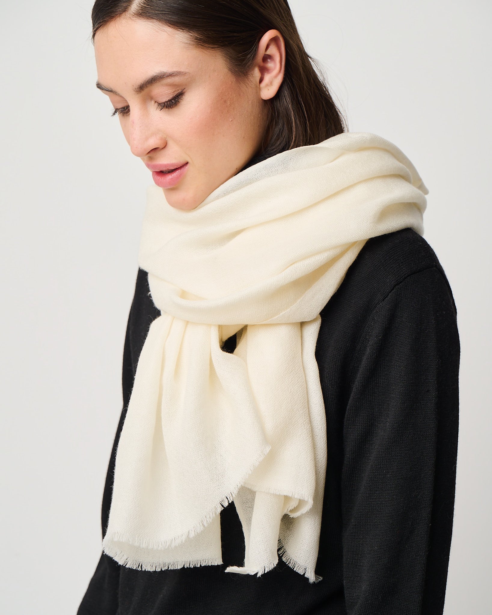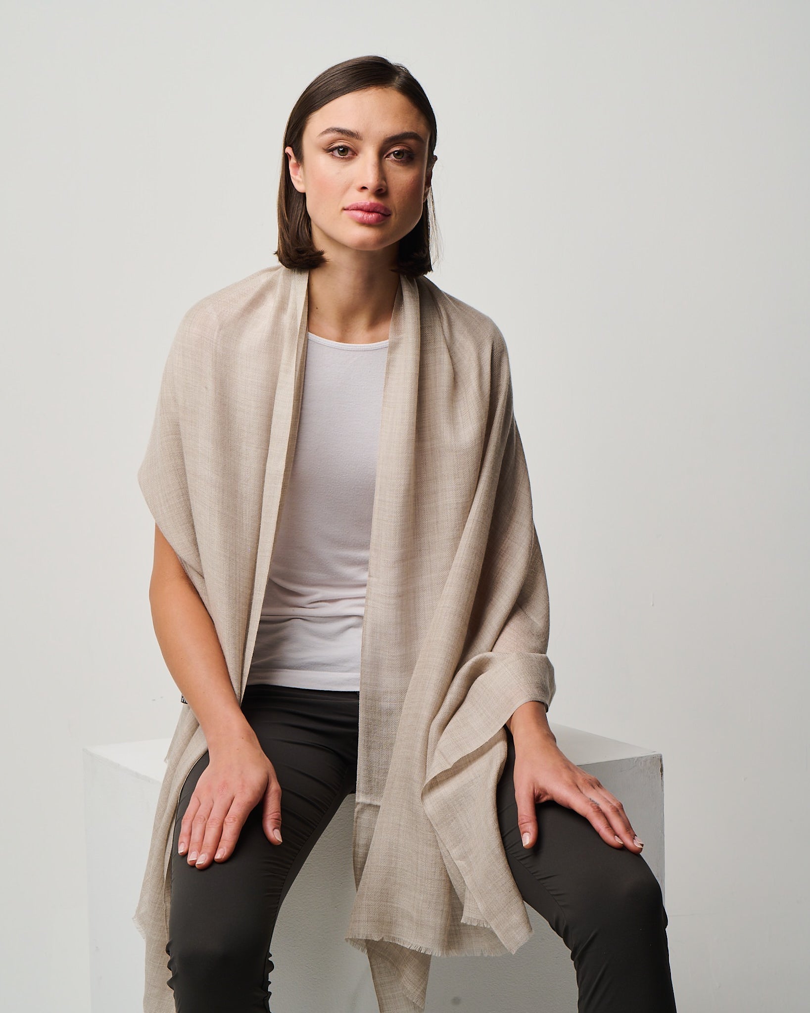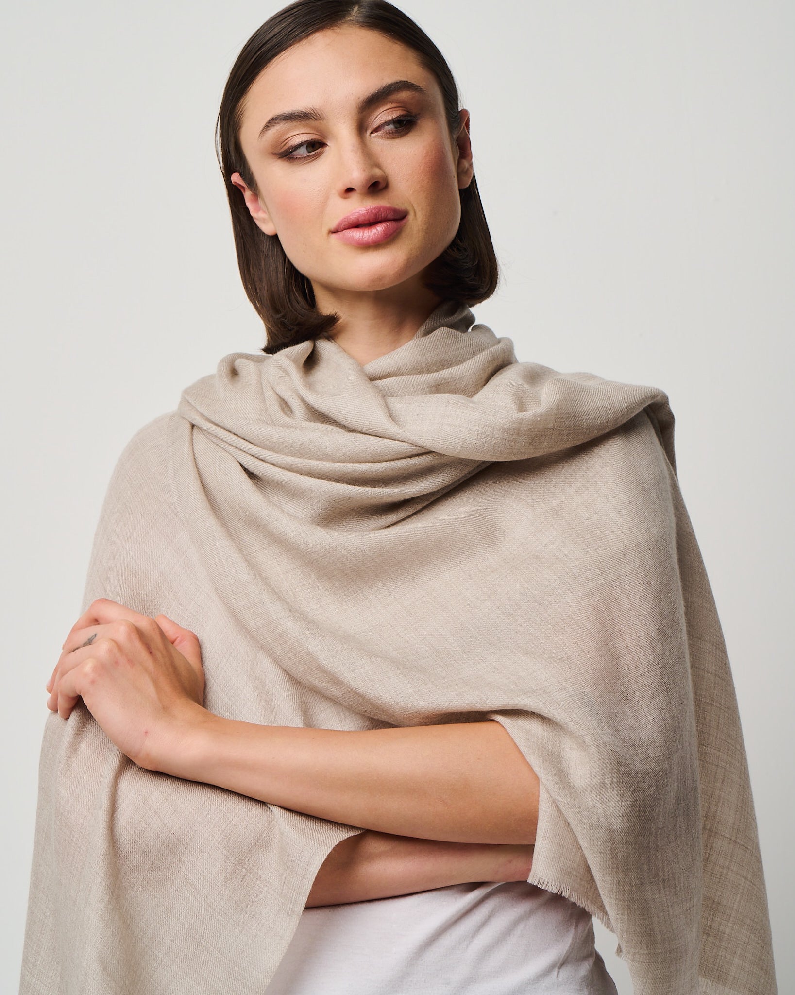 Crafted from the exquisite cashmere fibers of the Kashmir region, this whisper-light wrap embodies elegance in its purest form. It's featherweight texture drapes effortlessly as a scarf, shawl, or any other travel essential, offering cozy warmth without weight. Valentina is a timeless luxury designed for versatility, presence, and quiet indulgence. Easy on the eyes and dreamy to the hand-feel, Valentina is impossibly airy, deliciously soft, and indulgent to the touch. Crafted in Kashmir region from the finest cashmere fibers.